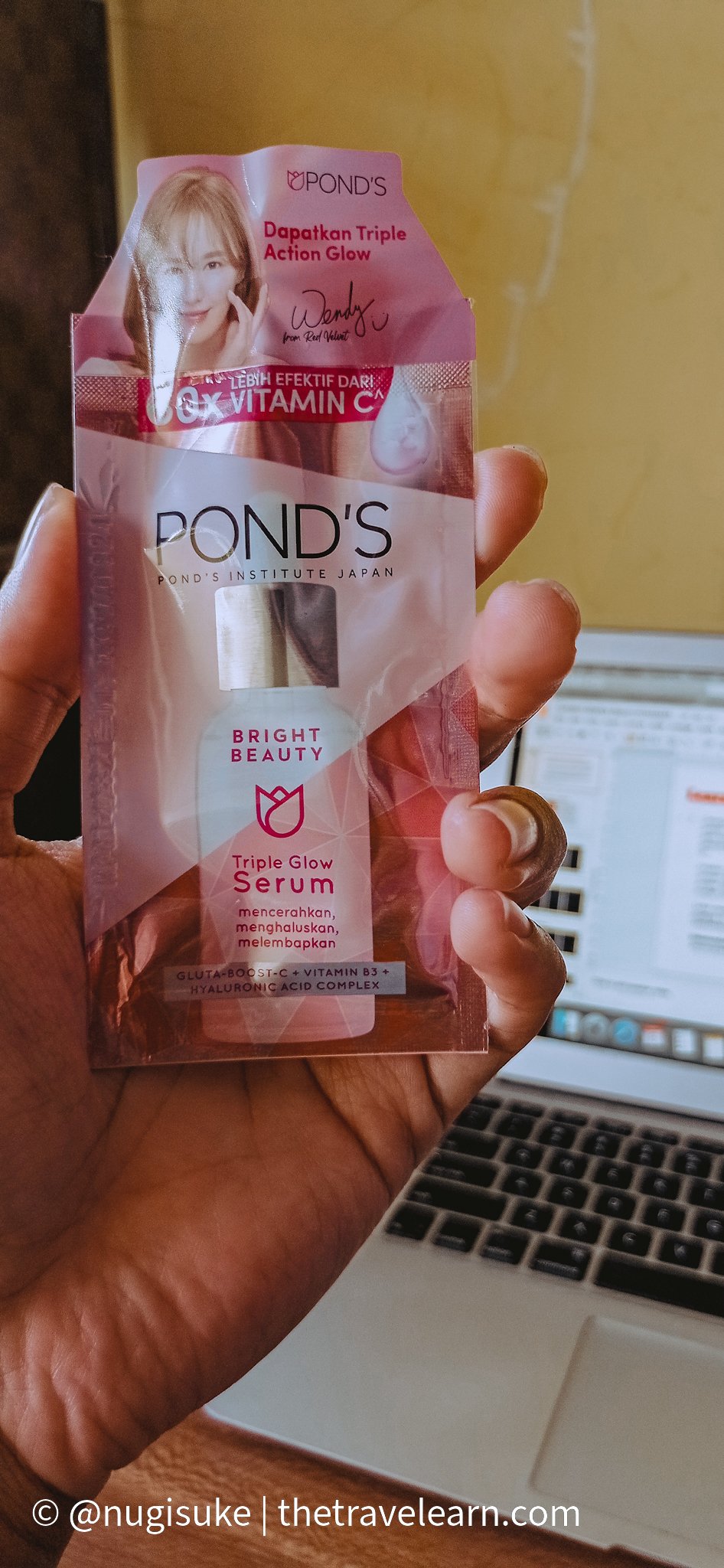 Dengan hati-hati, gue meratakan 3 tetes Pond’s Triple Glow Serum pada kulit wajah pagi itu, usai mandi.