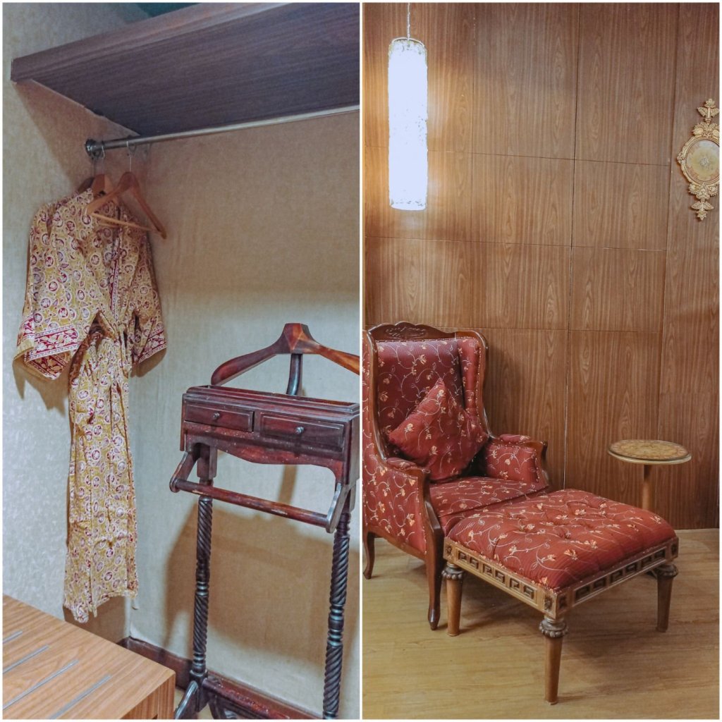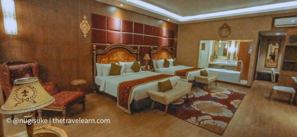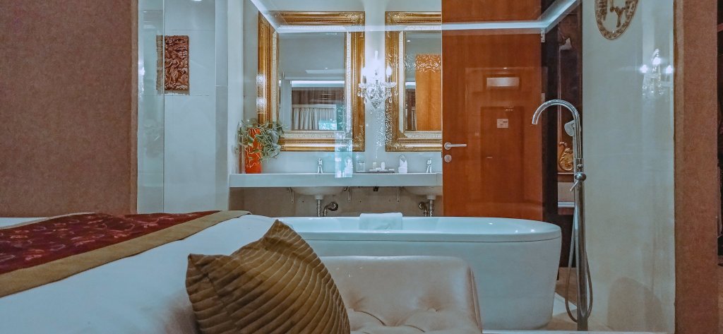 Begitu mas Kama mempersilakan masuk, gue langsung dibuat takjub dengan living area dan bedding area yang luaaasss banget! Warna-warna bumi seperti cokelat dan merah maroon mengguyur interior ruangan pada dinding, karpet, headboard, sofa, dan furnitur lainnya, mengukuhkan kesan elegan dan berkelas yang diusungnya. Ruang tamu tampil kaya dengan kandelaar yang meneranginya, sementara bedding area diisi dengan dua ranjang besar berkapasitas 4 orang. Ornamen-ornamen dekoratif bernuansa seni dan budaya nusantara ditempatkan di sana-sini tanpa proporsi berlebihan.
