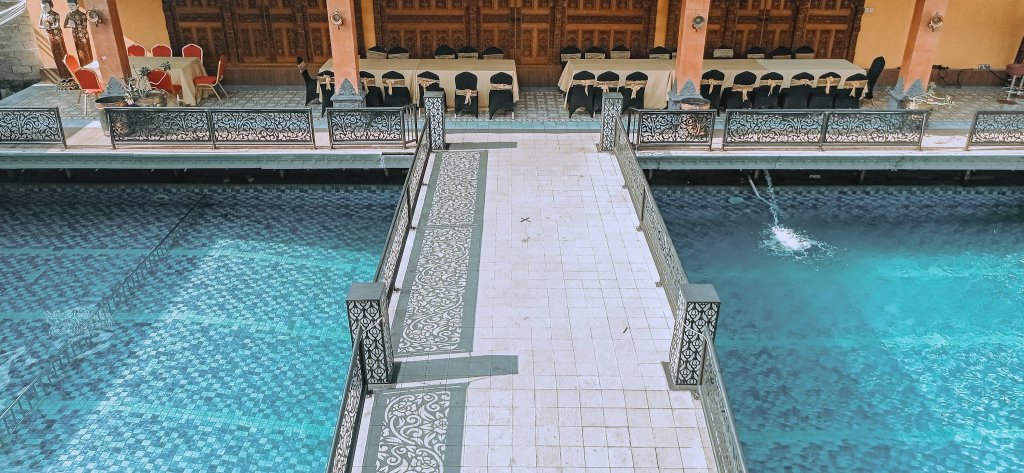 Kolam renang utamanya, yang bersisian dengan Ramayana Restaurant, oke banget. Ada jembatan lengkung yang apik sebagai spot berfoto atau mengambil foto. Jembatan juga menjadi batas antara area kolam anak dengan kolam dewasa sedalam 1,5 meter.
