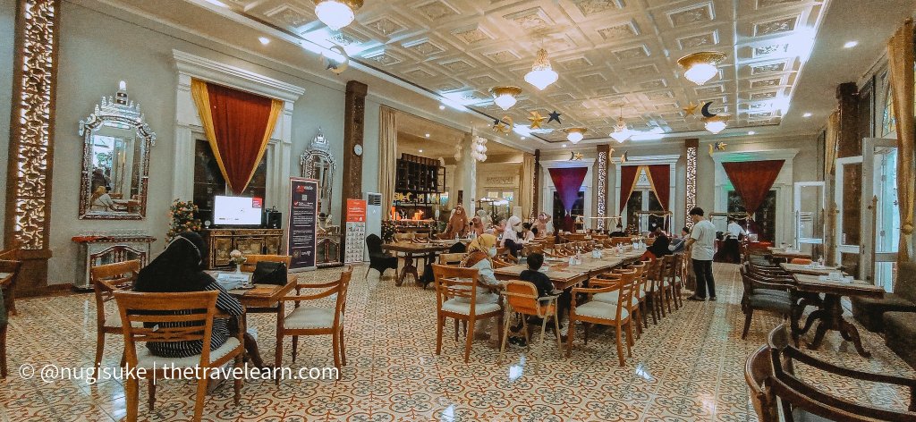 Selain makanannya yang enak-enak, yang gue suka dari paket berbuka Ramada Suites Solo ini adalah areanya yang luas! Satu makanan yang sama disiapkan pada 2 atau 3 titik, jadi nggak usah rebutan keroyokan sama tamu-tamu lainnya. Kalo digambarkan, Ramayana Restaurant ini berbentuk huruf L gemuk. Tamu bisa bersantap dengan romantis di tepi kolam renang, atau makan malam bak sultan di dalam gedung restoran yang dihiasi banyak ornamen dekoratif bernuansa Timur Tengah dan tradisional Indonesia. Keluarga dan rombongan besar lainnya biasa memilih area dalam karena disediakan meja-meja panjang dengan belasan kursi berhadap-hadapan.