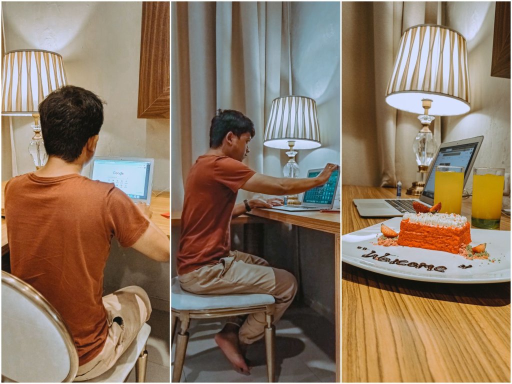 Fasilitas kamar juga terasa semakin manis dengan adanya romantic towel art, greeting card untuk kami sebagai couple, dan complimentary cake & drink yang tiba beberapa menit setelah kami masuk ke dalam kamar. Kaget, kirain siapa hehe.