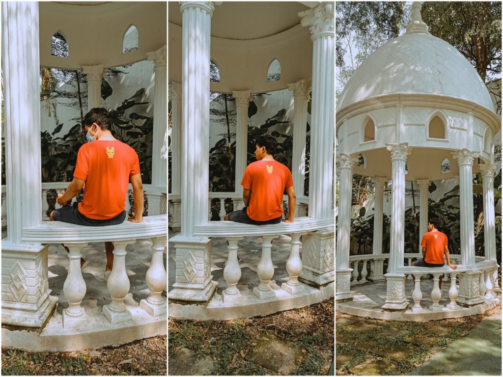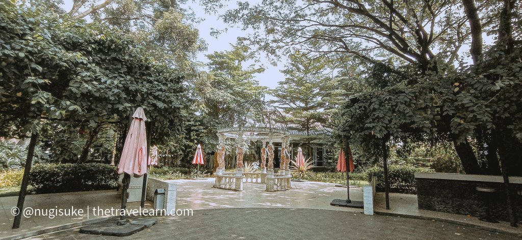 Berhadapan dengan arena bermain, ada outdoor venue yang bisa disewa untuk berbagai macam acara seperti pesta, pernikahan, syukuran, dsb. Di hari check-in aja ada yang lagi gelar lamaran. Dengan suasana yang hijau berpadu dengan patung-patung Eropa, outdoor venue ini memang jadi terkesan romantis~ Sebenarnya venue dilengkapi dengan bar, tapi kayaknya area bar ini sedang dikembangkan. Nggak jauh dari situ juga ada area yang diisi kanopi besar dari tanaman-tanaman menjalar dengan sebuah ruang bundar kecil terbuka khas Eropa, cocok buat sesi foto pre-wedding atau semacamnya.
