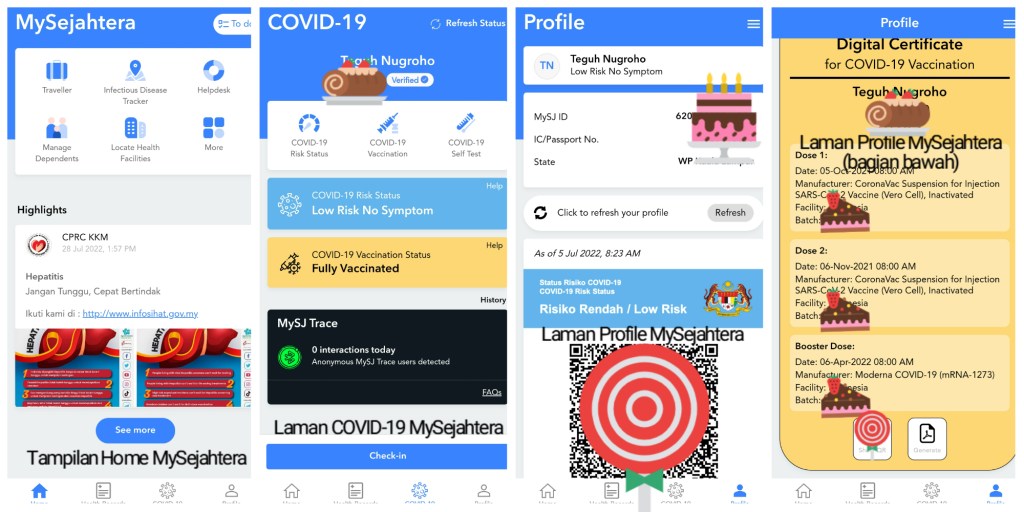 Tampilan Home (kiri), COVID-19, dan Profile (dua gambar kanan) aplikasi MySejahtera