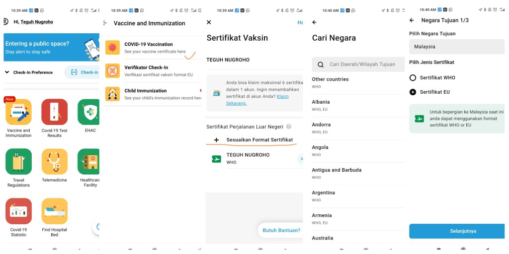 Masuk ke aplikasi PeduliLindungi, lalu pilih menu Vaccine and Immunization (eh maap, semua aplikasi di hape gue memang diatur dalam bahasa Inggris). Klik Vaccine Certificate (Sertifikat Vaksin). Nah, di bagian bawah ada Sertifikat Perjalanan Luar Negeri, klik tanda + bertuliskan Sesuaikan Format Sertifikat. Pilih negara tujuan, akan ada 2 jenis sertifikat yang bisa disesuaikan: WHO dan EU (Uni Eropa). Beberapa negara mungkin cuma bisa salah satu. Negara-negara Asia Tenggara menerima dua jenis sertifikat itu, tapi gue buat yang WHO.