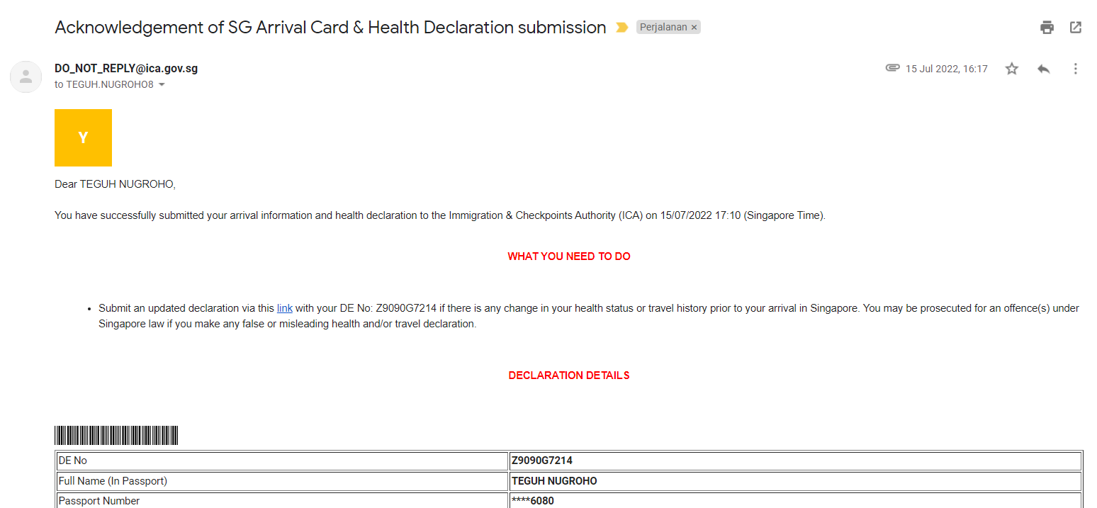 Setelah mengisi SG Arrival Card, nantinya kita akan mendapat email yang berisi Visit Pass.