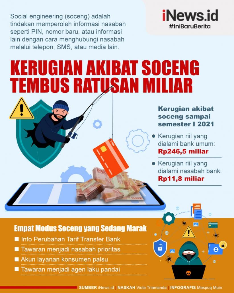 Berdasarkan sumber yang kuperoleh dari iNews, total kerugian karena soceng di semester 1 2021 aja udah lebih dari Rp250 milyar! Makanya nggak heran kalau salah satu bank nasional di Indonesia, BRI, pun aktif memerangi kejahatan soceng dengan menindaklanjuti pengaduan ke Siber Polda Metro Jaya.