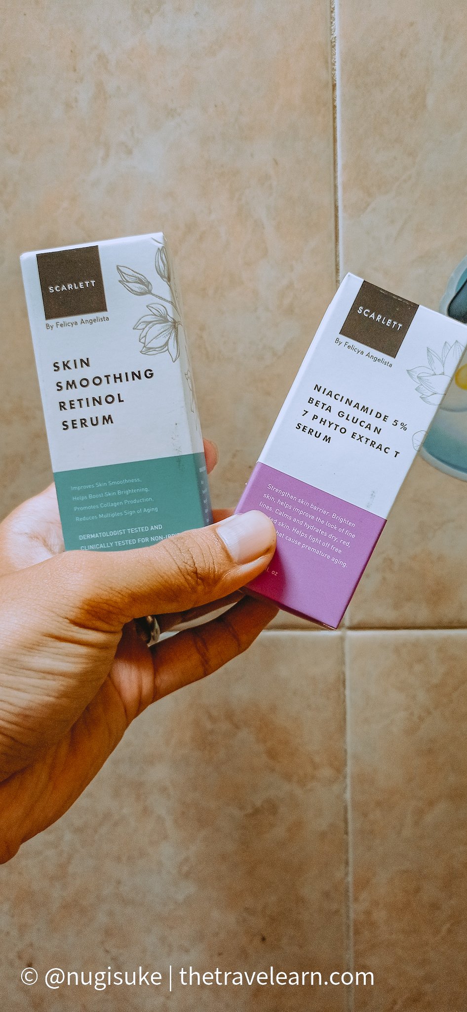 Pelarian berikutnya adalah perawatan diri, seperti mandi, face care, dan skin care. Dengan kondisi gue belakangan ini yang harus banyak wara-wiri di bawah teriknya cuaca Yogyakarta, gue mencari-cari produk perawatan wajah yang kira-kira bisa melindungi bahkan memperbaiki penampilan wajah. Nggak bisa yang terlalu wangi nyegrak, karena indera penciuman Ara sedang sangat sensitif. Gue menjatuhkan pilihan pada Scarlett Niacinamide 5% + Beta Glucan & 7 Phyto Extract Serum dan Scarlett Skin Smoothing Retinol Serum. Oh iya, ini produk baru, jadi gue makin excited buat cobain.