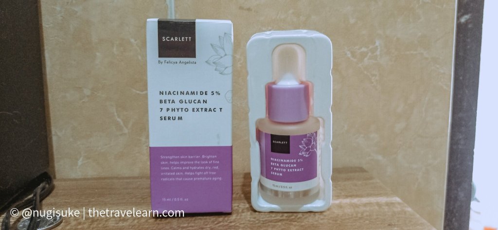 Cara pemakaiannya juga gampang dan praktis, tinggal teteskan 2-3 cairan serum lalu oleskan merata pada wajah yang sudah dibersihkan. Pijat-pijat dikit dan biarkan beberapa saat hingga serum meresap sempurna ke dalam kulit wajah. Gue biasa mengaplikasikan Scarlett Niacinamide 5% + Beta Glucan & 7 Phyto Extract Serum ini pada pagi hari.
