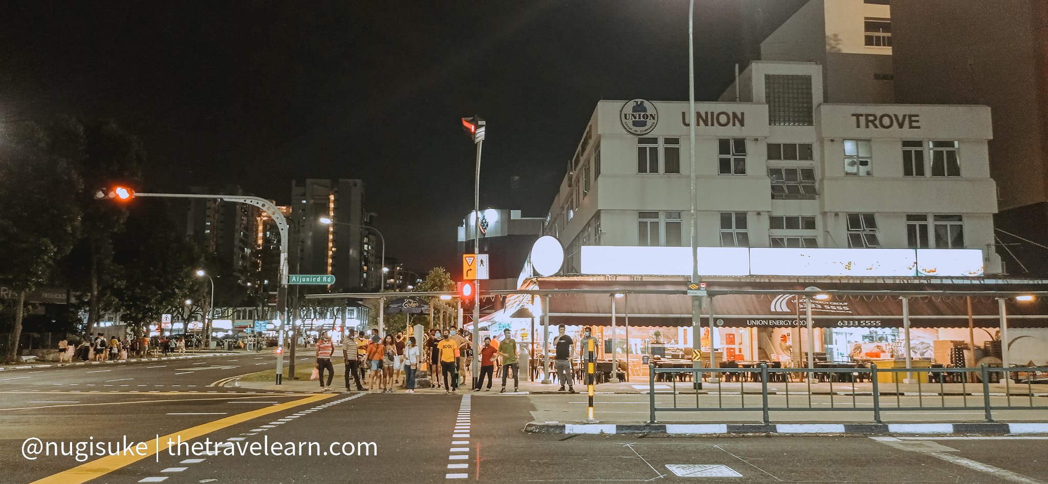 Setelah ditempuh dengan berjalan kaki, ternyata jarak BudgetOne Hotel masih cukup jauh dari Stasiun MRT Aljunied, padahal ini sudah stasiun terdekat. Ara sudah kelelahan sampai kami harus berhenti sejenak di pinggir jalan yang teduh. Geylang/Kallang sendiri adalah kawasan yang gersang.