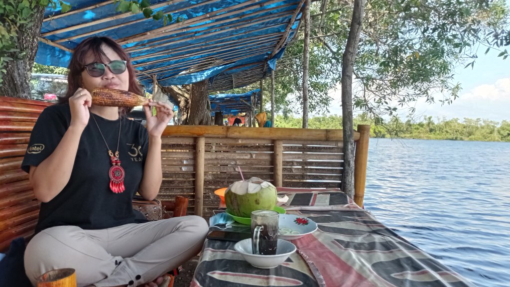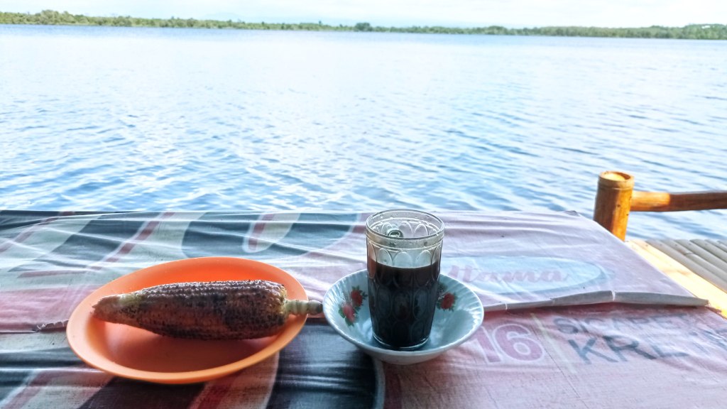 Kami acak saja memilih salah satu warung, memarkirkan sepeda motor, dan menempati bangku yang menghadap danau. Aku memesan nasi goreng dan kopi hitam panas (tetep ya), sementara Ara memilih jagung bakar dan kelapa utuh. Rasanya? Aku biasanya memiliki penerimaan tinggi soal rasa. Tapi untuk makanan yang kupesan ini, monmaap nasi goreng bikinanku sendiri masih lebih enak 😂