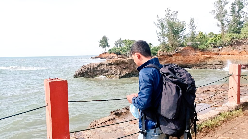 Setelah puas dan merasa bosan, kami beranjak ke area lainnya Pantai Sungai Suci. Di bagian ini, ada tebing yang menjorok ke lautan, bahkan ada batu karang kecil yang benar-benar terpisah dari daratan utama, terhubung oleh jembatan gantung. Tentu saja, jembatan gantung itu dikomersilkan, ada tiket masuk untuk pengunjung yang mau memasukinya. Masih murah sih, Rp5 ribu saja. Meski pendek dan nggak terlalu tinggi, tapi sudah cukup membuat nyaliku yang fobia ketinggian ini ambyar 😂 Coba lihat saja ekspresiku saat melewati jembatan gantung di video ini.