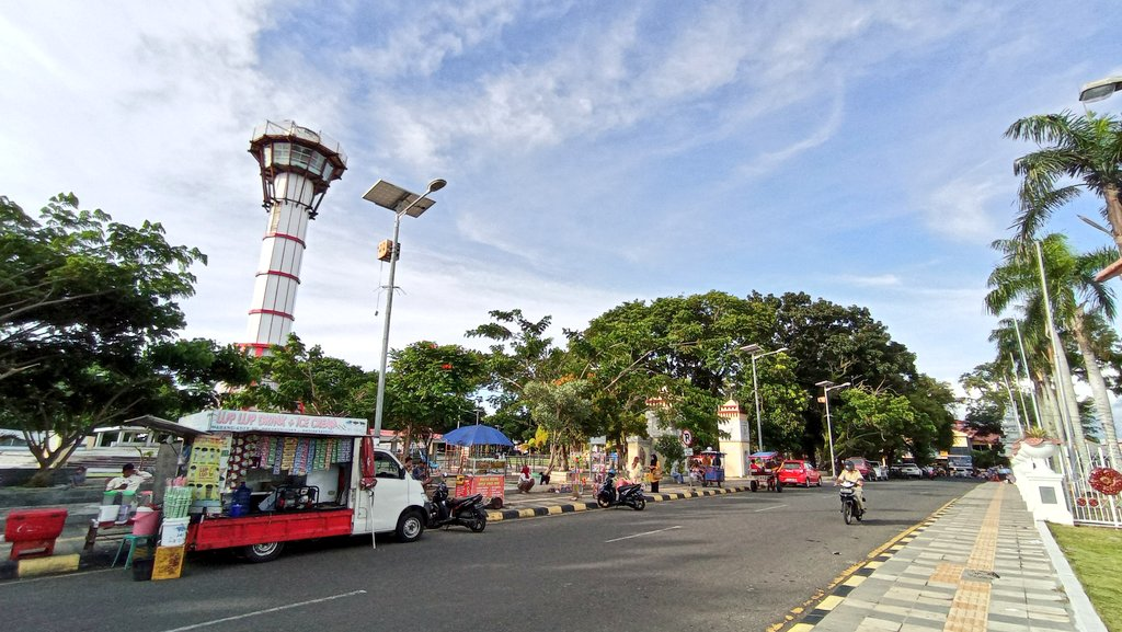 Di seberangnya ada taman dan Alun-Alun Kota Bengkulu beserta Tsunami Tower (View Tower) yang ikonik dan.. terbengkalai, haha. Sayang sekali, padahal bisa jadi atraksi yang menarik hati. Di taman, aku dan Ara menikmati es dari salah satu penjual yang banyak menjajakan makanan dan minuman di sekitar taman.