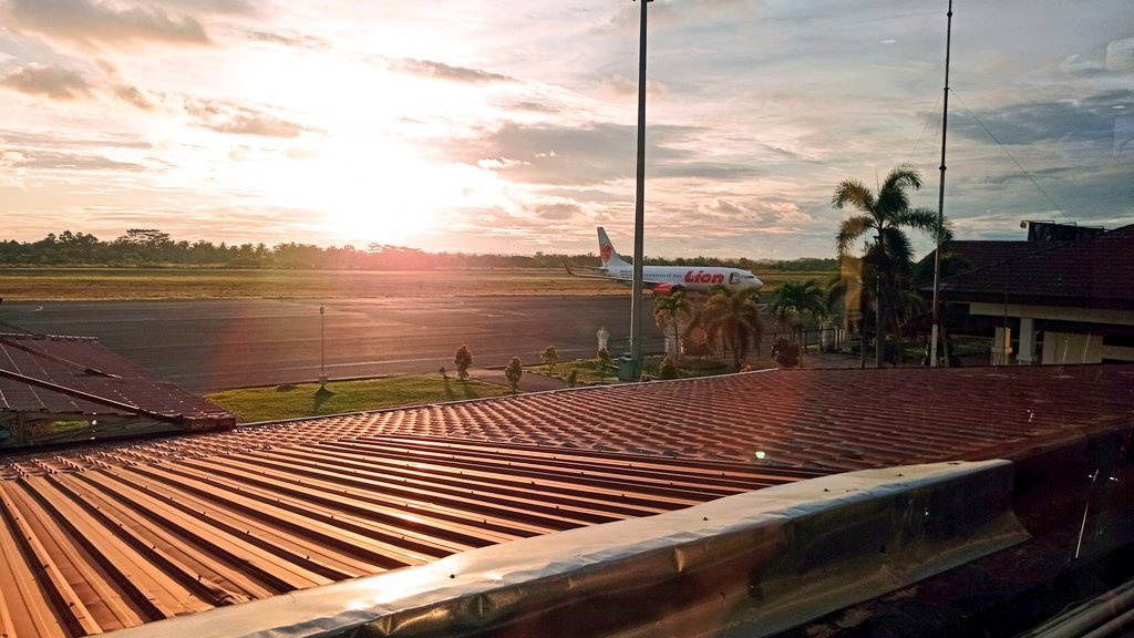 Tak ada tempat makan di dalam bandara, sehingga kami harus sedikit jalan kaki berpanas-panasan menuju kantin di seberang sana. Tidak ber-AC dan atapnya dari baja ringan. Untung saat itu cuacanya masih cukup sejuk. Aku memesan, ehem, lagi-lagi nasi goreng dan kopi hitam panas 😂 Syukurlah kali ini lebih enak. Selesai makan dan sedikit rehat, kami check-in dan masuk ke dalam boarding room.