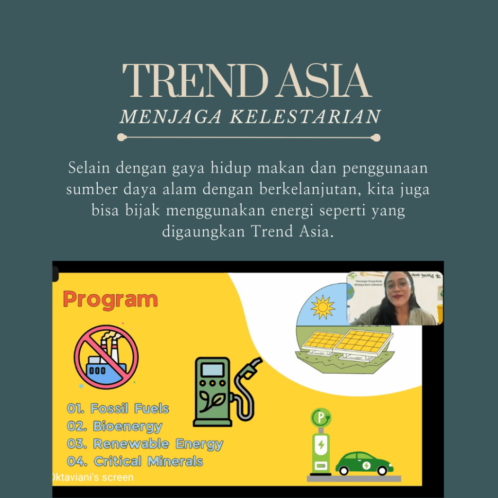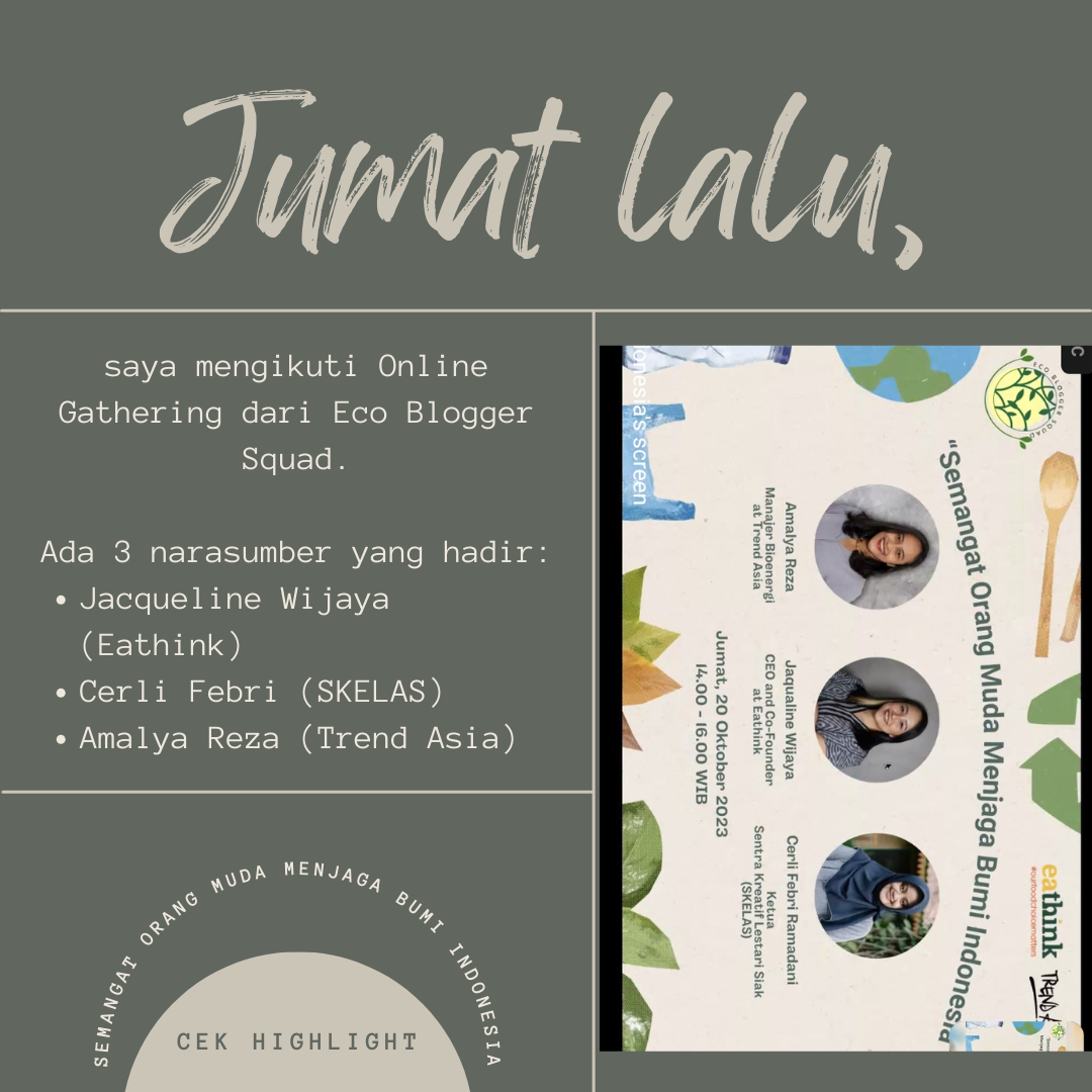 Jaqualine dan teman-teman Eathink bukan satu-satunya inisiatif yang lahir dari anak muda Indonesia untuk menjaga alam nusantara. Dalam online gathering tersebut, hadir juga kak Cerli Febri Ramadani selaku Ketua Sentra Kreatif Lestari Siak (SKELAS) dan kak Amalya Reza selaku Manajer Bioenergi di Trend Asia. Cocok lah dengan tema yang diangkat dalam kegiatan hari itu, Semangat Orang Muda Menjaga Bumi Indonesia.