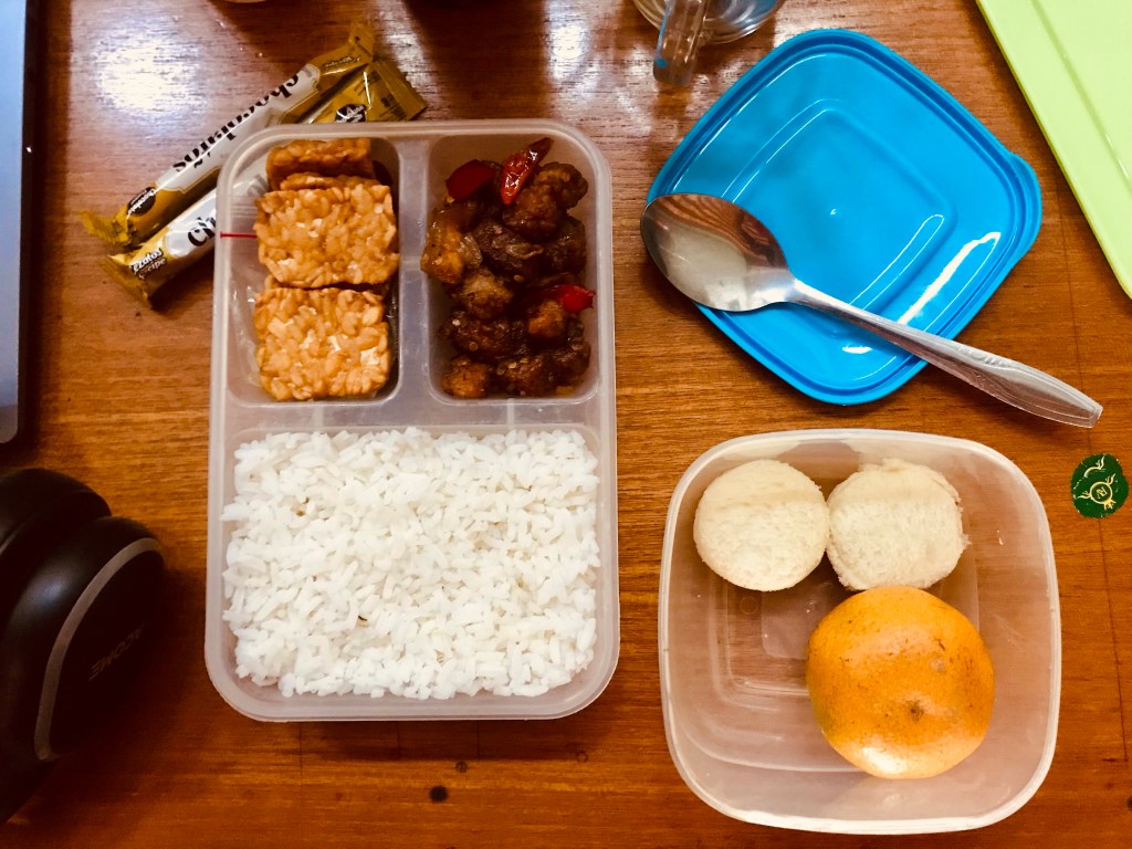 Kedua, membawa bekal makanan (dan minuman) berarti juga meminimalisir sampah. Nyaris tidak ada sampah bungkus makanan, sendok plastik, sedotan, botol plastik, dsb, hanya di saat-saat tertentu saja ketika saya butuh doping tambahan untuk menjalani hari. Saya jadi tidak menambah sampah plastik dan makanan yang sudah menumpuk di bumi ini 😂