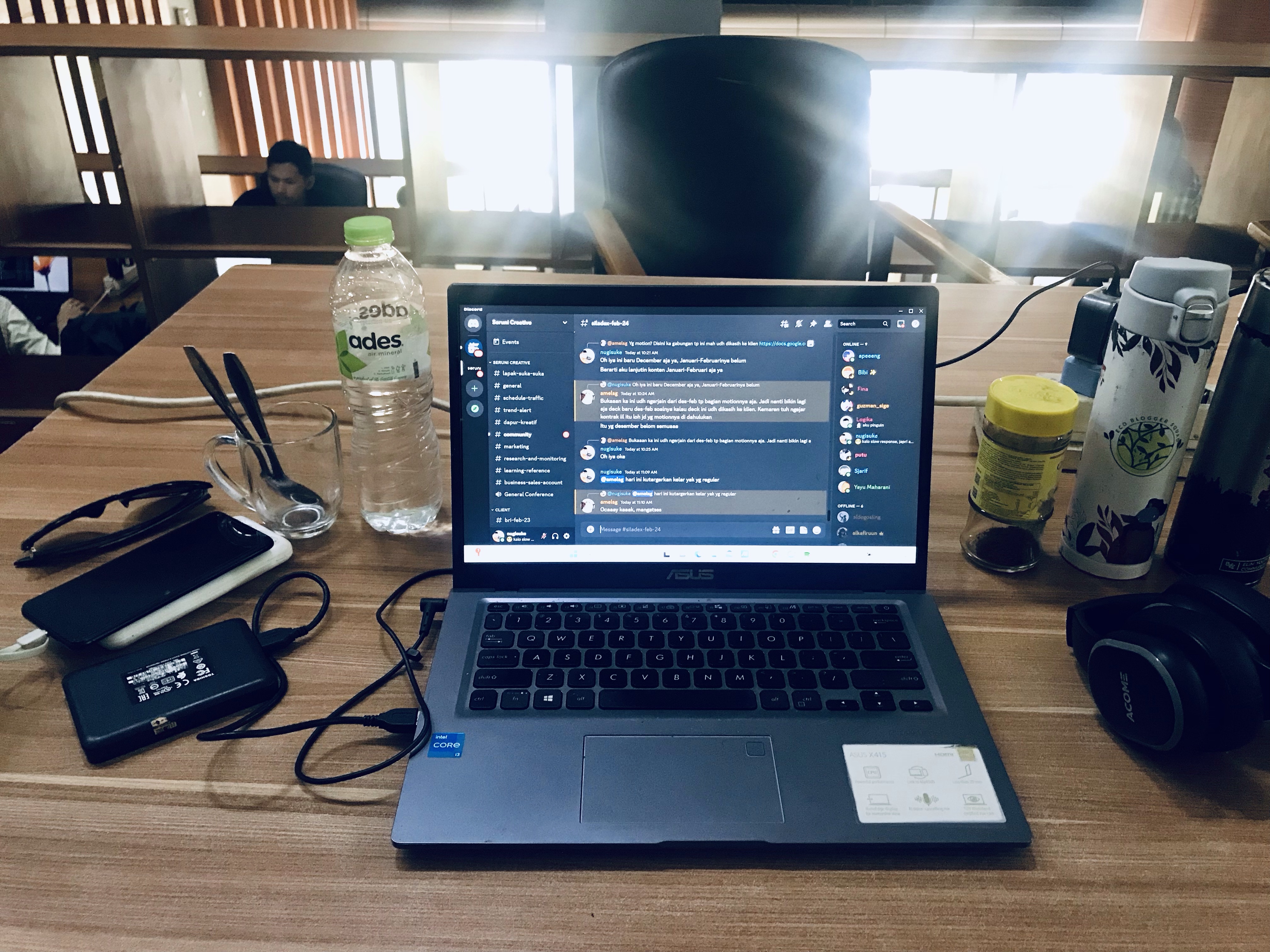 Suasana meja kerja saya di Bandung Creative Hub, air mineral itu dibeli karena Bandung sedang panaass!