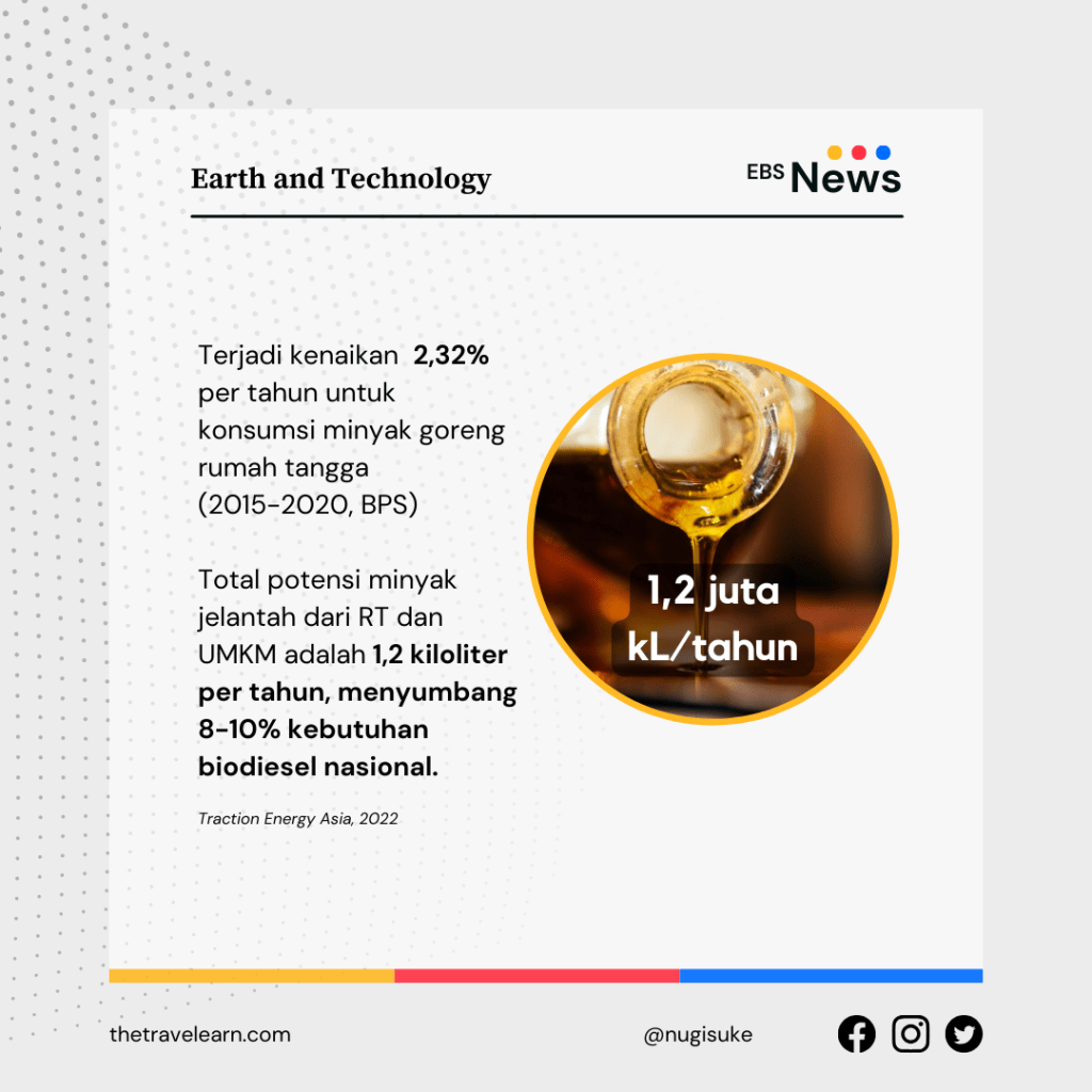 Yes, kamu tidak salah dengar. Minyak jelantah dapat digunakan sebagai sumber energi terbarukan. Minyak jelantah memiliki komposisi kimia yang mirip dengan kelapa sawit sebagai bahan baku biodiesel. Selain itu, minyak jelantah juga merupakan limbah yang “berbiaya rendah” dan juga minim emisi gas rumah kaca. Pemanfaatan minyak jelantah sebagai bioenergi perlu ditingkatkan, karena setiap tahun terjadi peningkatan konsumsi minyak goreng rumah tangga sebesar 2,32% pada periode 2015-2020 (Badan Pusat Statistik). Jika digabungkan dengan UMKM, potensi minyak jelantah secara nasional adalah 1,2 juta kilo liter, atau setara dengan 8-10% kebutuhan biodiesel nasional.