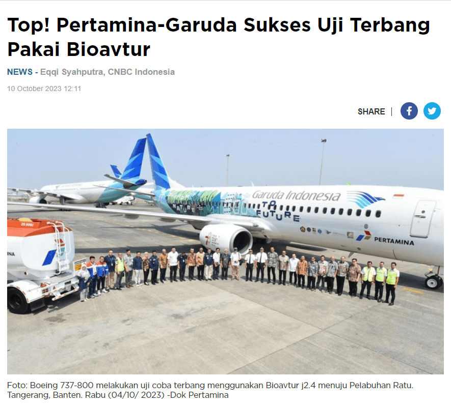 Lalu, bagaimana penerapannya sejauh ini? Bulan lalu, uji terbang pesawat komersil dengan Sustainable Aviation Fuel (SAF) sukses dilakukan. SAF adalah energi terbarukan berbasis bioenergi. Bahan bakar dengan komponen nabati ini disebut Bioavtur, dan diproduksi di Green Refinery Kilang Cilacap oleh PT Kilang Pertamina Internasional (KPI). Green Refinery RU IV Cilacap ini sudah dikembangkan sejak Februari 2022. Produk utamanya adalah Green Diesel yang bahan bakunya 100% terbarukan!