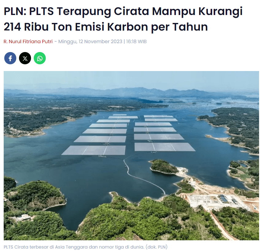 Indonesia juga patut berbangga, karena Pembangkit Listrik Tenaga Surya (PLTS) terbesar se-Asia ada di Indonesia, tepatnya di PLTS Terapung Cirata, kabupaten Purwakarta, Jawa Barat. Setelah menjalani uji coba pada Oktober 2023 lalu, rencananya PLTS ini akan mulai beroperasi pada awal 2024. Pembangkit listrik tenaga surya apung pertama di Asia Tenggara ini dibangun di atas area seluas kurang lebih 250 hektar dengan lebih dari 340.000 panel surya. PLTS Cirata diproyeksikan mampu menekan emisi karbon hingga lebih dari 200.000 ton per tahun. Membanggakan banget!