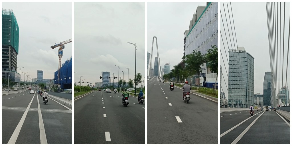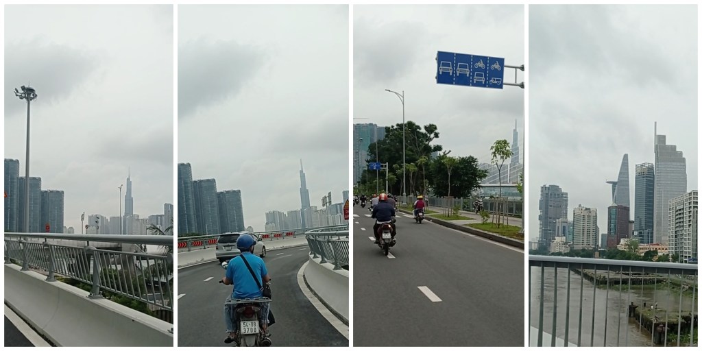 Anh mengarahkan sepeda motornya menaiki jalan layang sebelum akhirnya berbelok ke kanan. Kami berkendara melalui Cầu Ba Son, atau Jembatan Ba Son, melintas di atas Sungai Saigon. Jembatan ini terbilang anyar, baru saja dibuka di tahun 2022.