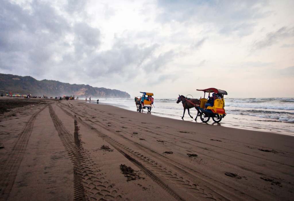 Parangtritis berbeda dari pantai – pantai Gunungkidul yang berbatu. Di sini, hamparan pasir hitam vulkanik yang luas bertemu langsung dengan ombak besar Samudra Hindia, menciptakan latar yang terasa liar, lebar, dan bebas. Saat air surut, permukaan pasir basah memantulkan langit sore seperti cermin raksasa — dan bayangan kuda serta penunggangnya yang terpantul di sana bisa menjadi salah satu foto terbaik yang dibawa pulang dari seluruh perjalanan ke Jogja.