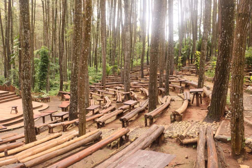 Deretan pinus yang tertata rapi menciptakan koridor alami yang dramatis, sangat ideal untuk foto siluet atau tampilan “moody forest” yang sering muncul di feed Instagram bertema earthy. Di beberapa titik, terdapat panggung kayu, gardu pandang, dan area duduk sederhana yang bisa dijadikan set foto tanpa perlu banyak properti tambahan.